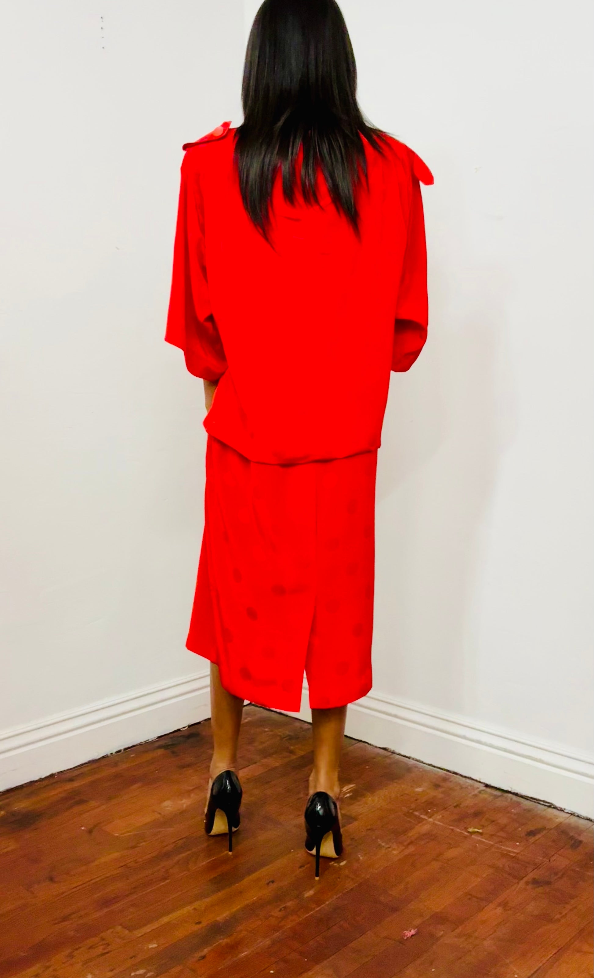 Vintage red dress with textured polka dots, made from a lightweight and soft fabric that offers both comfort and style. It features wide kimono-style sleeves, adding an elegant and sophisticated touch. Perfect for special occasions or for those looking for a unique piece with a retro vibe. The flowing design flatters different body types, making it ideal for any season. A timeless classic that never goes out of style